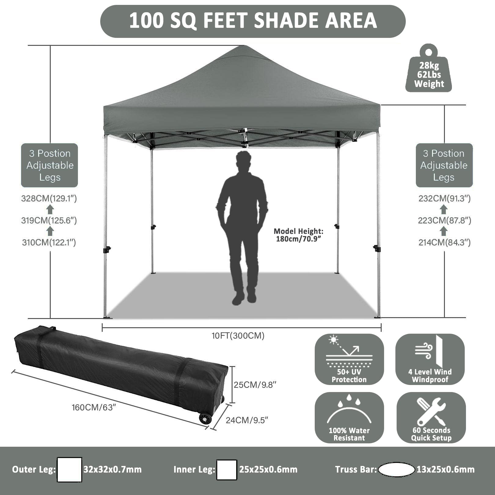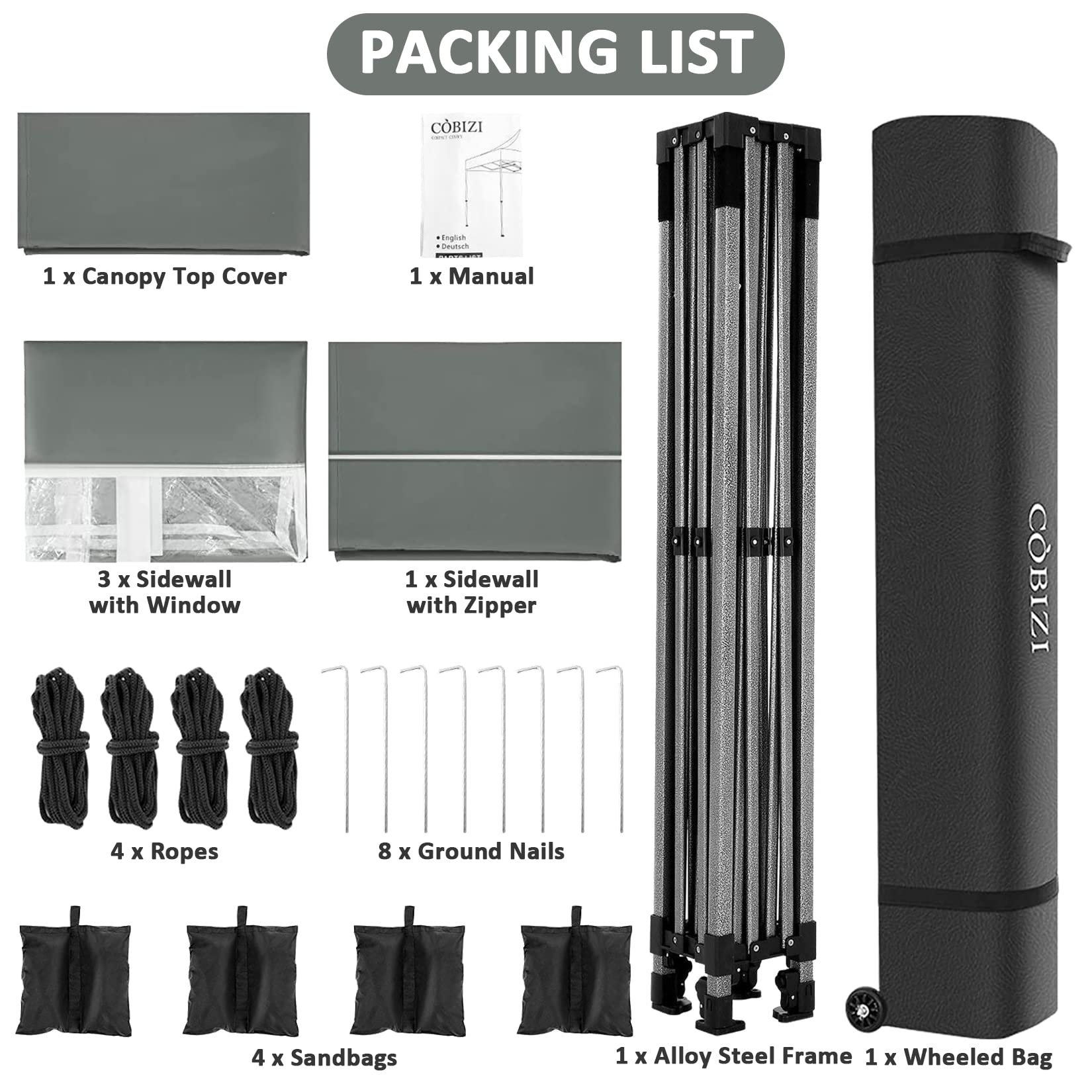 - 【Aufbewahrungstasche auf Rädern】Die Aufbewahrungstasche mit Rollen misst 160x25x24cm aus 600D Oxford-Gewebe. Rollbare Aufbewahrungstasche mit zwei Rädern an der Unterseite für einfachen Transport. 2 Griffe an der Seite für 2 Personen zum Anheben. Das Paket beinhaltet: Überdachungsrahmen x 1 Pcs + Überdachungszeltabdeckung x 1 Pcs + Seitenwand mit Reißverschluss x 1 Pcs + Seitenwand mit Fenster x 3 Pcs + Sandsack x 4 Pcs + Bodennägel x 8 Pcs + Seile x 4 Pcs + Aufbewahrungstasche x 1 Pcs.