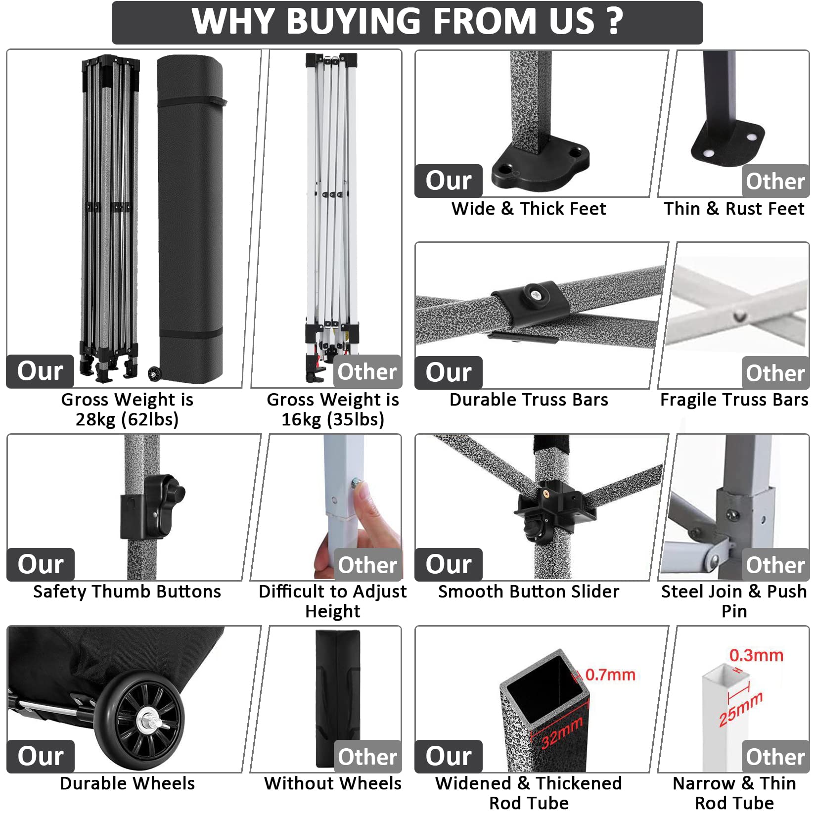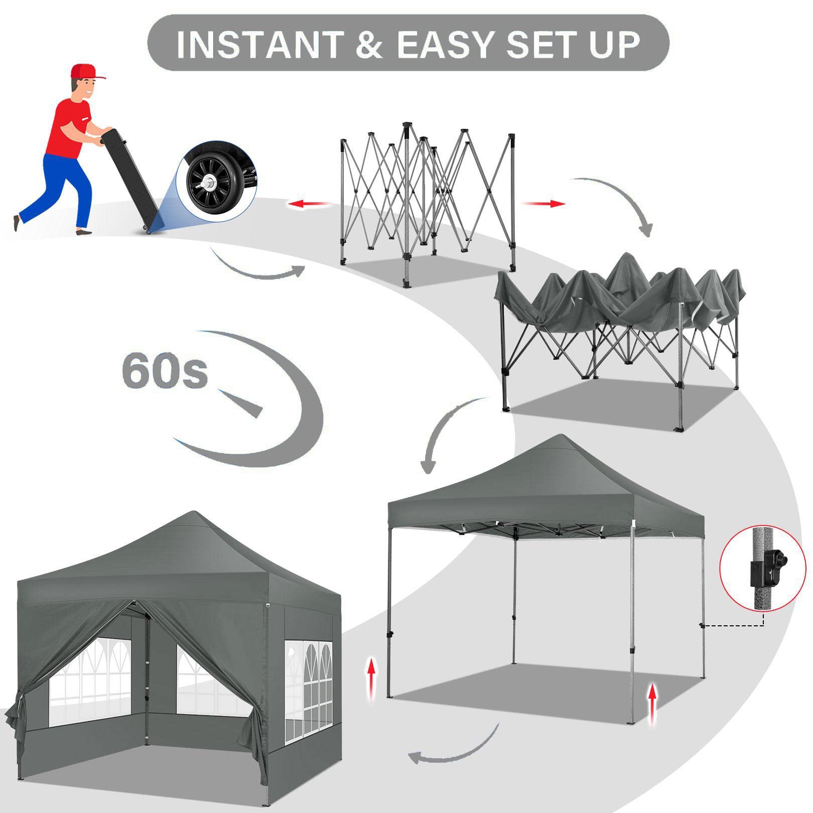 - 【3 Höheneinstellungen】Das Partyzelt mit geraden Beinen hat 3 Höheneinstellungen. Daumenverriegelungssystem einfach zu verriegeln und zu lösen, heben Sie das Zelt auf eine gewünschte Höhe. Optionen für gerade Beinhöhen: 214cm/84,3Zoll, 223cm/87,8Zoll, 232cm/91,3Zoll. Entsprechende Optionen zur Höhe der Zeltmittelhöhe: 310cm/122,0Zoll, 319cm/125,6Zoll, 328cm/129,1Zoll. 3x3m Pavillon Ideal für Geschäftsveranstaltungen, Camping, Festivals, Hochzeit, Flohmarkt, Marktstand und Familientreffen.