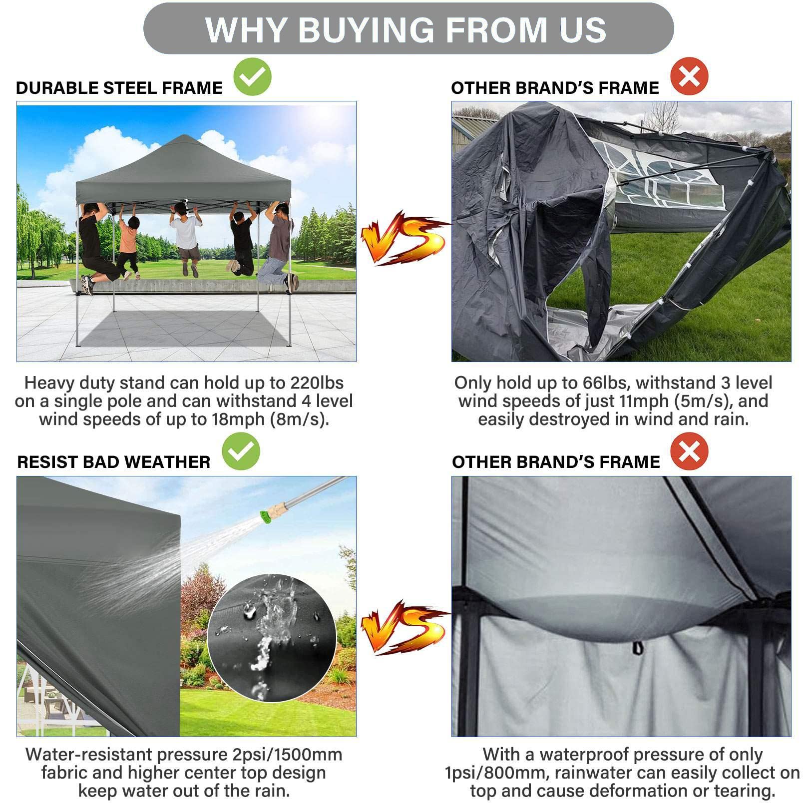 - 【Lass dein Zelt nicht unbeaufsichtigt】Bitte beachten Sie, dass unsere Produkte für den täglichen Gebrauch zum Schutz vor Sonne und leichtem Regen konzipiert sind. Bauen Sie das Überdachungszelt IMMER ab, wenn ein Sturm aufzieht. Sichern Sie das Zelt während des Gebrauchs immer mit den mitgelieferten Heringen und Seilen, um Schäden zu vermeiden. Ein Jahr Nachverkaufsschutz für Überdachungsrahmen; Sechs Monate Nachverkaufsschutz für Stoffe und Accessoires.